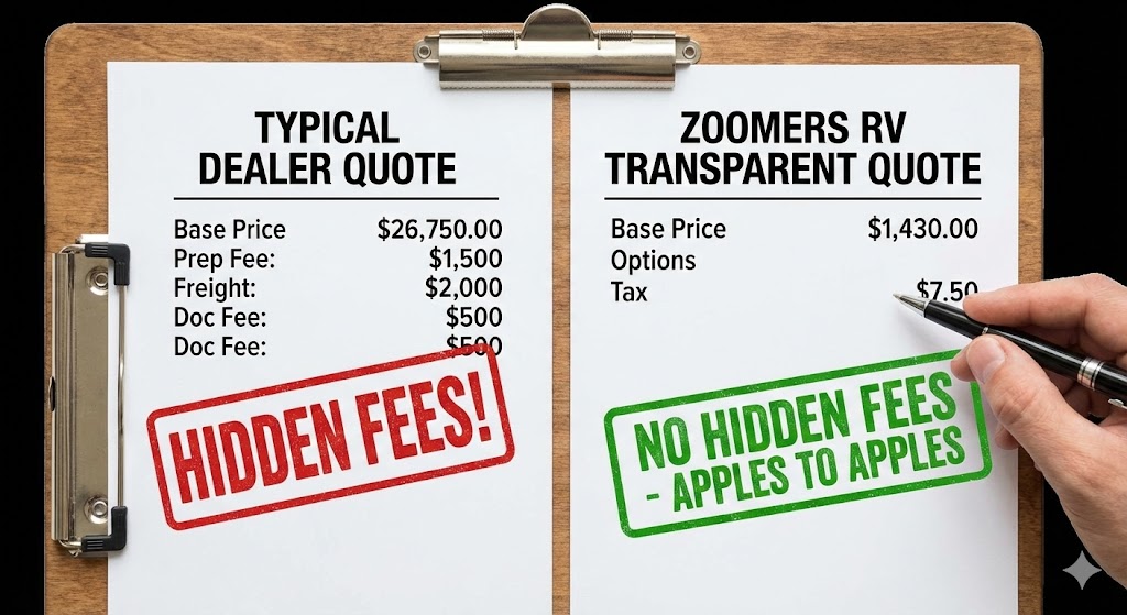 One of our biggest missions at Zoomers RV is transparency. We often tell our customers to “Compare Apples to Apples.” Many local dealers might show a lower “sticker price” online, only to hit you with $2,000 in “Prep Fees,” $1,500 in “Freight Fees,” and a “Walkthrough Fee” the moment you sit down in the finance office.
