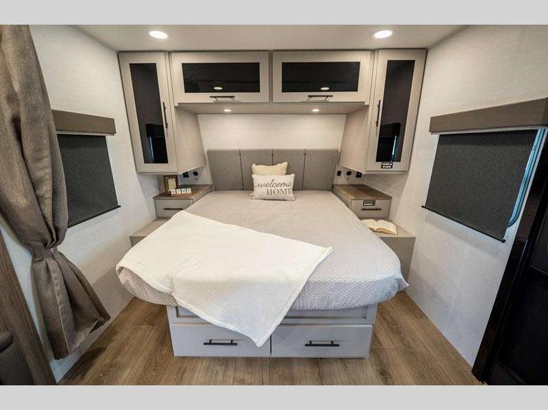 Exterior highlights include Step Above steps on all doors, Goodyear Endurance tires, exterior awning controls, and more. Inside, you'll enjoy fully functional oversized atrium windows, soft closet hidden hinges, and no carpet to make cleaning up easier than ever.
