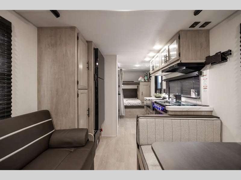 Sleeps 9 Slides 1 Length 32 ft 9 in Ext Width 8 ft Ext Height 10 ft 5 in Int Height 0 ft Hitch Weight 755 lbs GVWR 7755 lbs Dry Weight 6403 lbs Cargo Capacity 1352 lbs Fresh Water Capacity 52 gals Grey Water Capacity 38 gals Black Water Capacity 38 gals Furnace BTU 20000 btu Number Of Bunks 2 Available Beds RV King Refrigerator Type 12V Cooktop Burners 3 Number of Awnings 1 Water Heater Type Tankless AC BTU 15000 btu Cargo Deck Size 0 ft Awning Info 15' Full Length Power w/LED Light Strip Axle Count 2 Shower Type Tub/Shower Combo Solar Wattage 200 watts Similar Floorplans