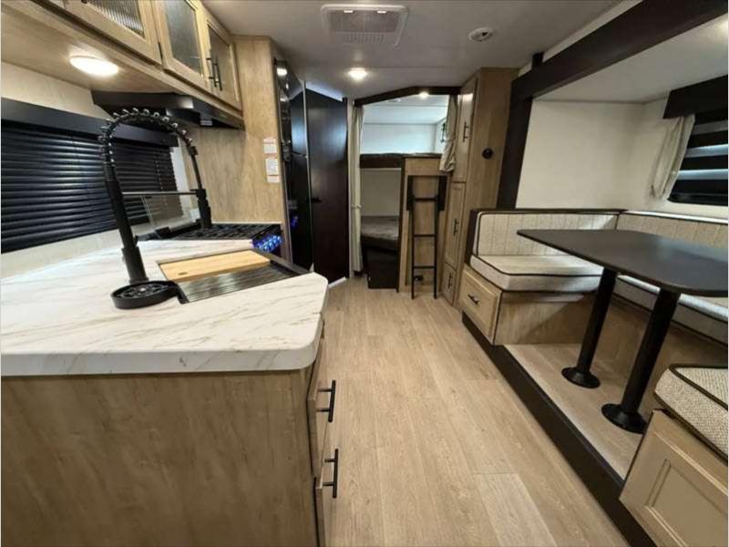 Sleeps 9 Slides 1 Length 31 ft 9 in Ext Width 8 ft Ext Height 10 ft 8 in Int Height 0 ft Hitch Weight 940 lbs GVWR 7940 lbs Dry Weight 6507 lbs Cargo Capacity 1433 lbs Fresh Water Capacity 52 gals Grey Water Capacity 38 gals Black Water Capacity 38 gals Furnace BTU 20000 btu Number Of Bunks 2 Available Beds RV King Refrigerator Type 12V Cooktop Burners 3 Number of Awnings 1 Water Heater Type Tankless AC BTU 15000 btu Cargo Deck Size 0 ft Awning Info 15' Full Length Power w/LED Light Strip Axle Count 2 Shower Type Tub/Shower Combo Solar Wattage 200 watts Similar Floorplans