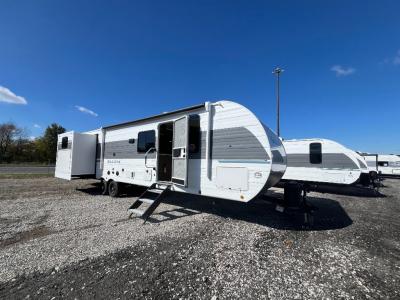 Sleeps 10 Slides 3 Length 36 ft 7 in Ext Width 8 ft Ext Height 11 ft 5 in Hitch Weight 905 lbs Dry Weight 8573 lbs Cargo Capacity 1292 lbs Fresh Water Capacity 39 gals Grey Water Capacity 40 gals Black Water Capacity 27 gals Number Of Bunks 3 Available Beds Custom King Refrigerator Type Double Door Frost Free 12V Refrigerator Size 11 cu ft Cooktop Burners 3 Number of Awnings 1 Water Heater Capacity 6 gal Water Heater Type Gas/Electric DSI AC BTU 13500 btu Awning Info 18' Power w/ Adjustable Legs Axle Count 2 Shower Type Tub/Shower Combo Electrical Service 30 amp Similar Travel Trailer Floorplans